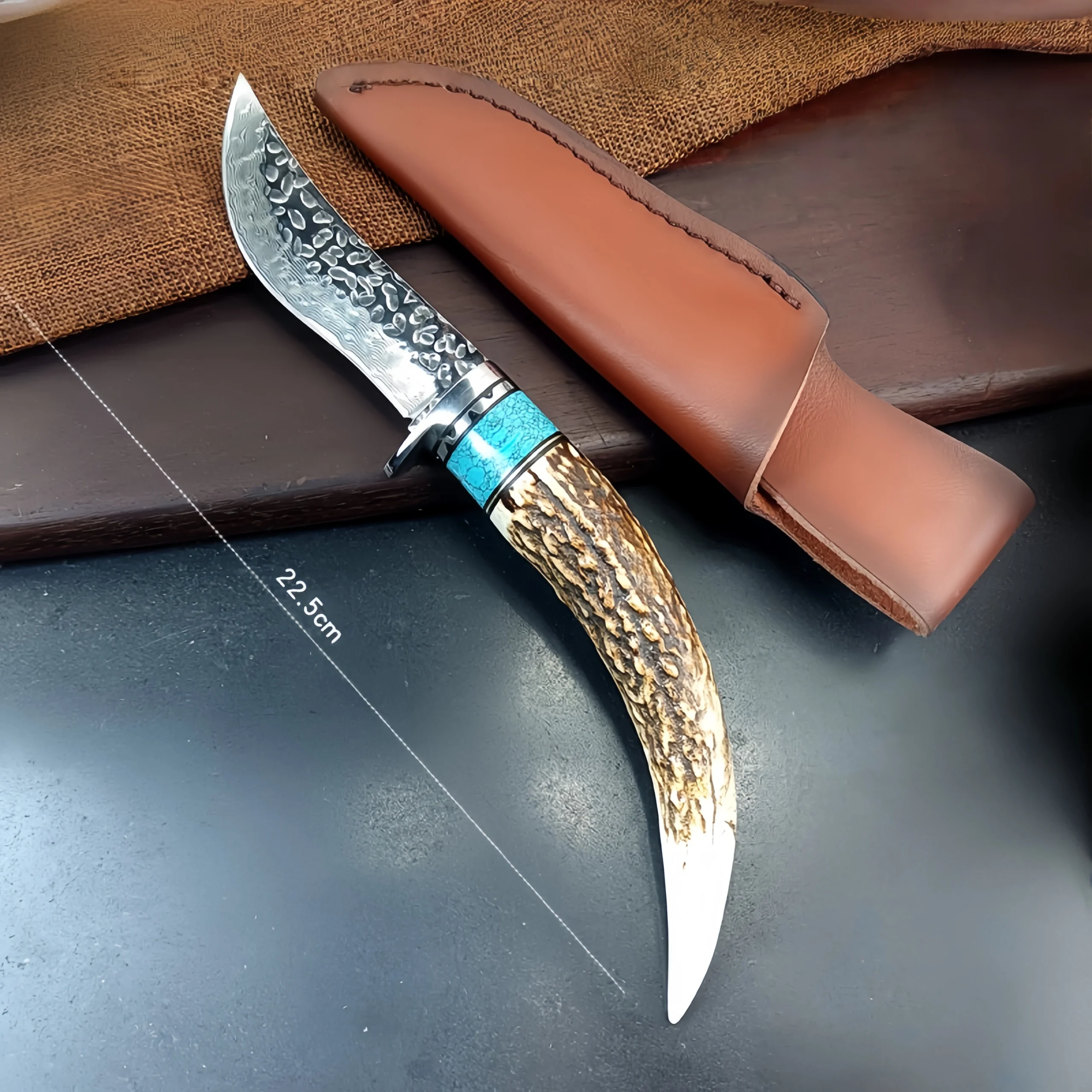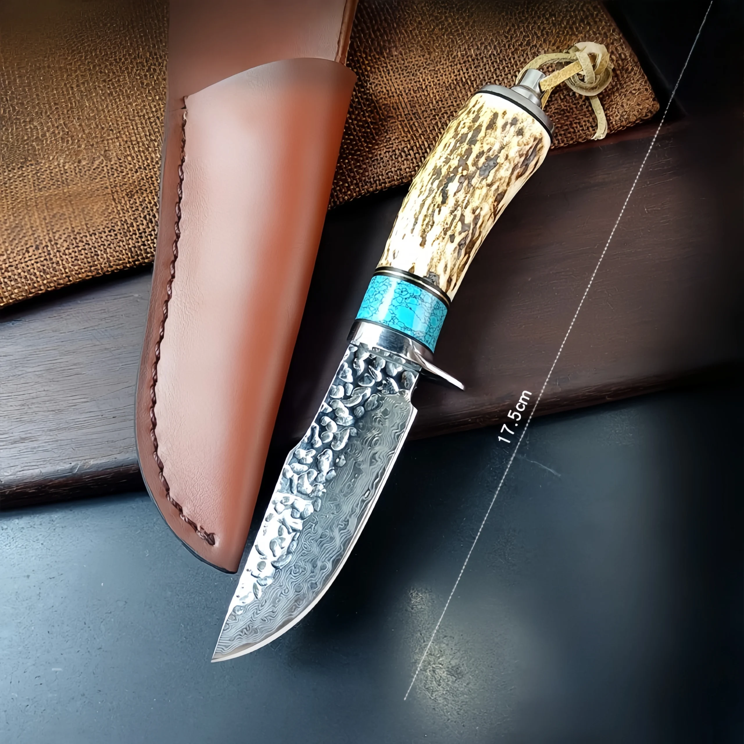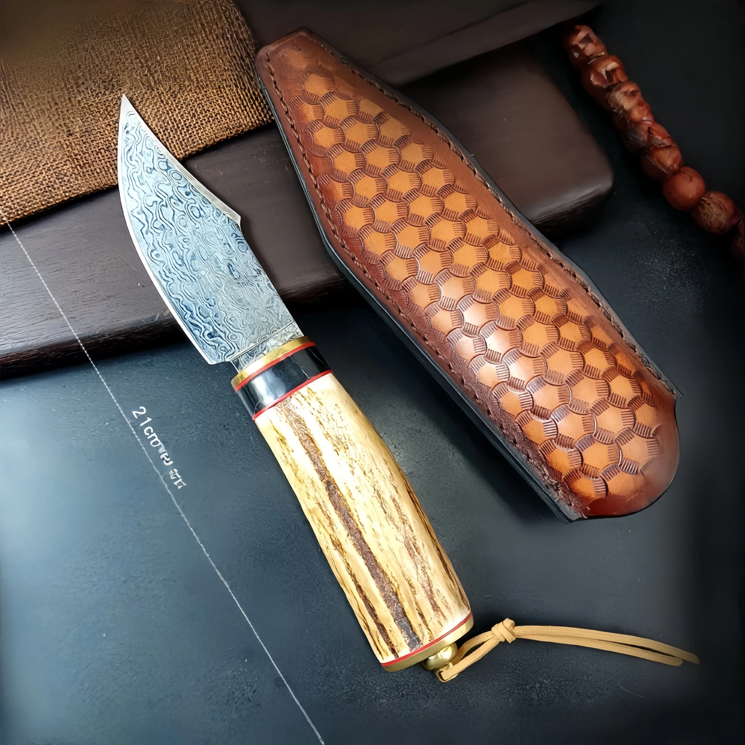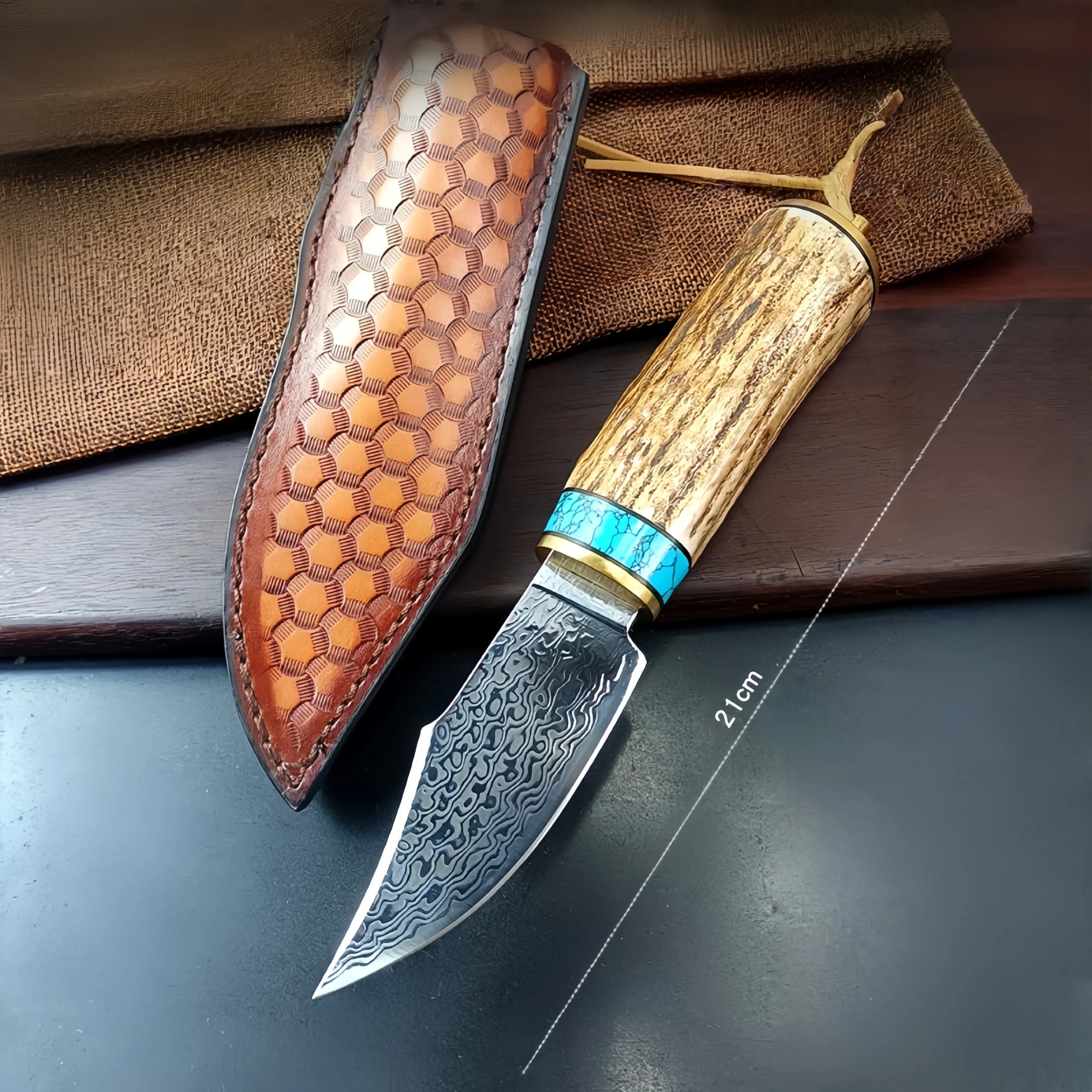 Damascus forged steel camping small straight knife antler handle knife