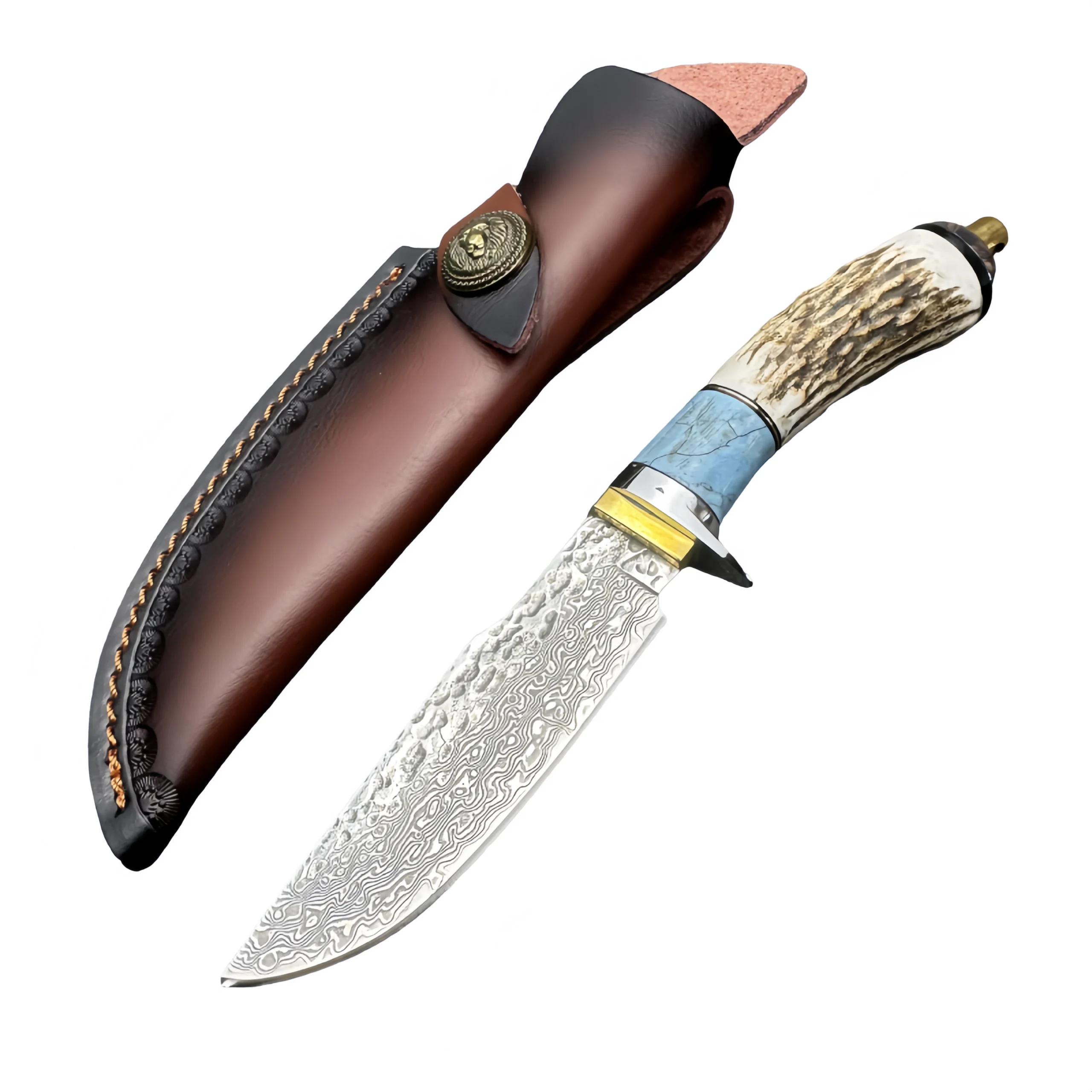 Collection of straight Damascus knife with antler inlaid brass handle and cowhide sheath
